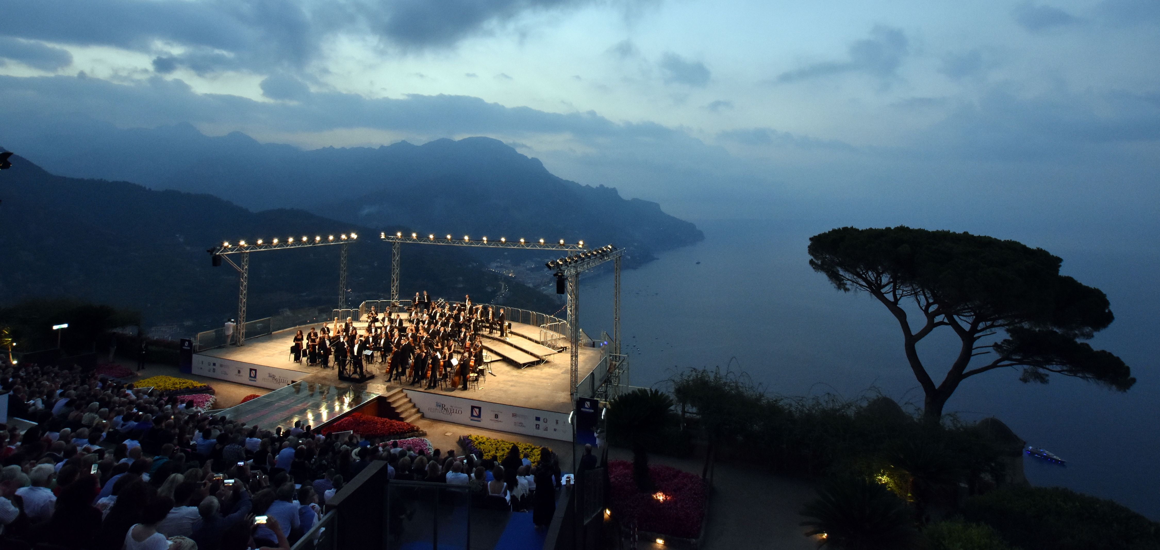 Genießen Sie das Konzert bei Sonnenaufgang hoch über dem Meer und den Bergen der Amalfiküste, während das Orchester auf einer eigens für dieses Ereignis installierten Bühne zwischen Himmel und Meer zu schweben scheint. Ein unvergesslicher Augenblick.